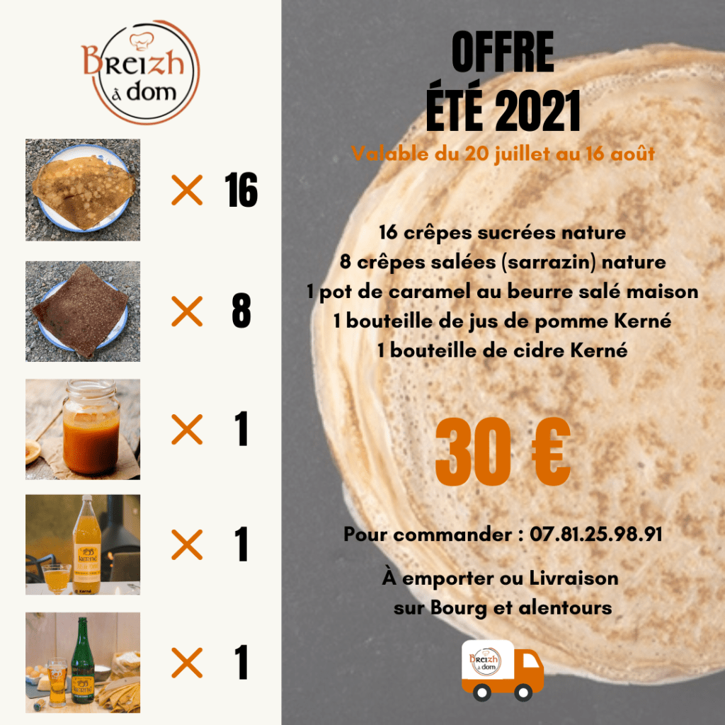 À Emporter ou Livraison à domicile sur Bourg et alentours. Valables jusqu’au 16 août.